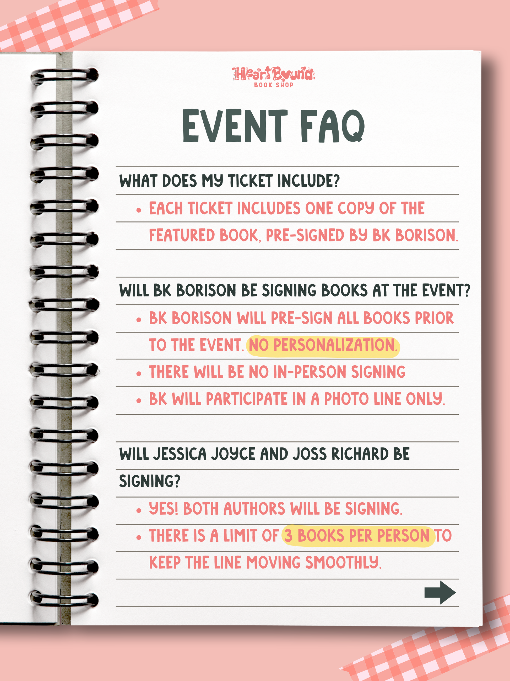 The evening will feature a thoughtful conversation, followed by a signing with Jessica and Joss, and a photo line with B.K.