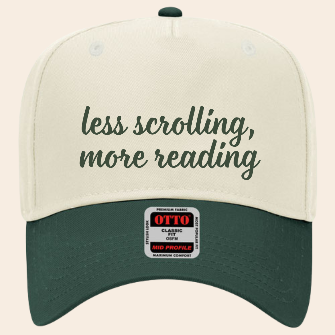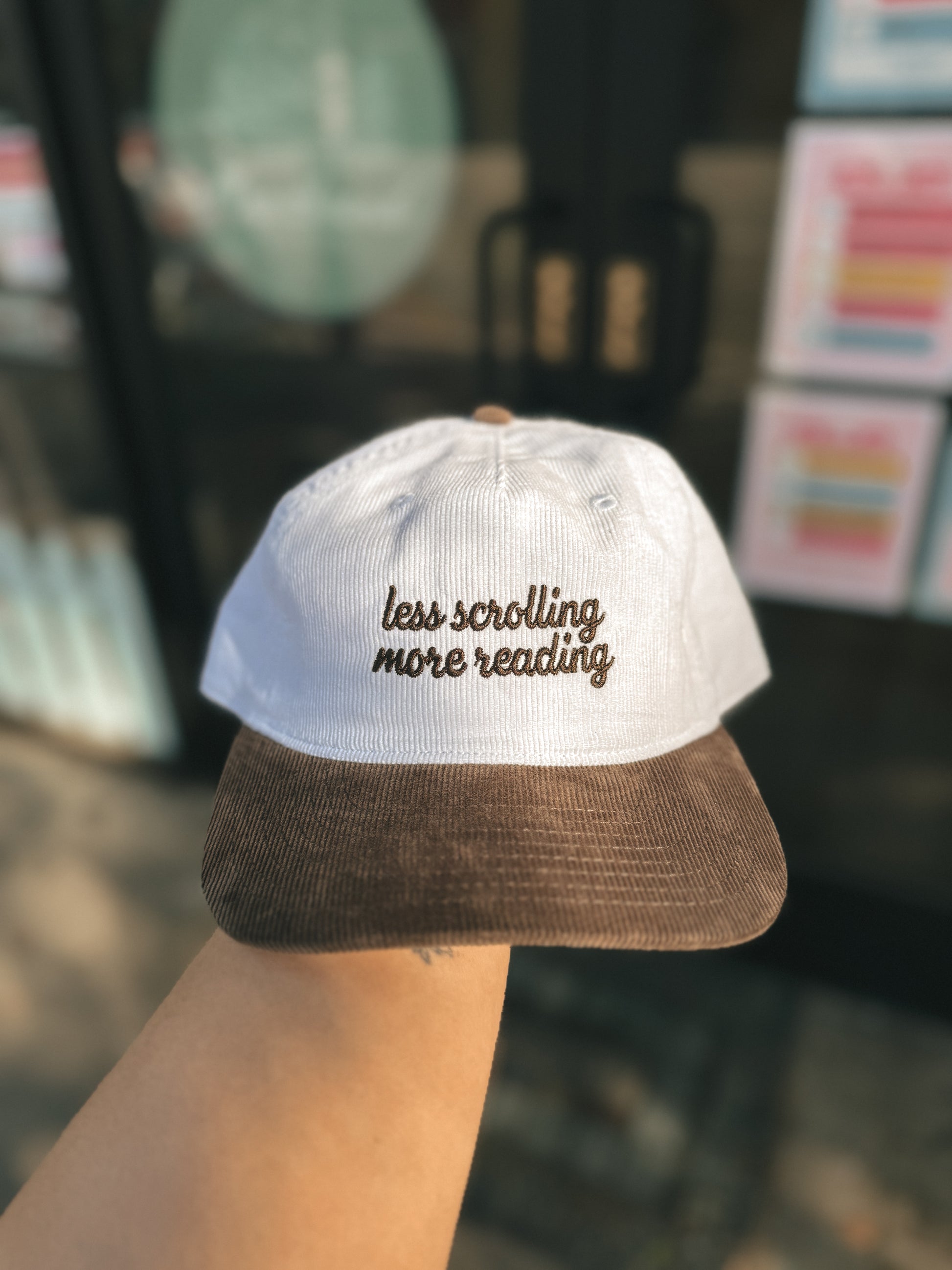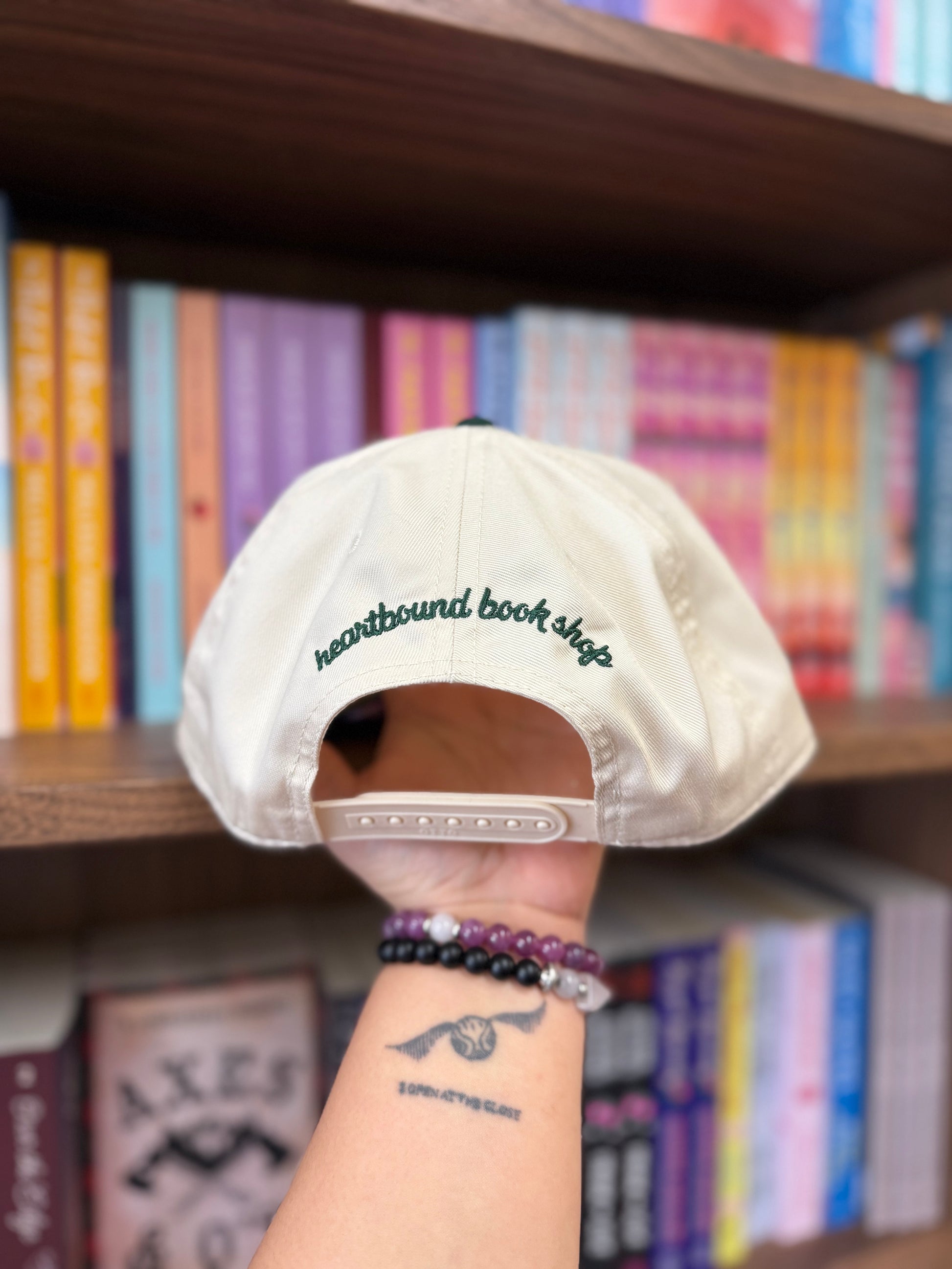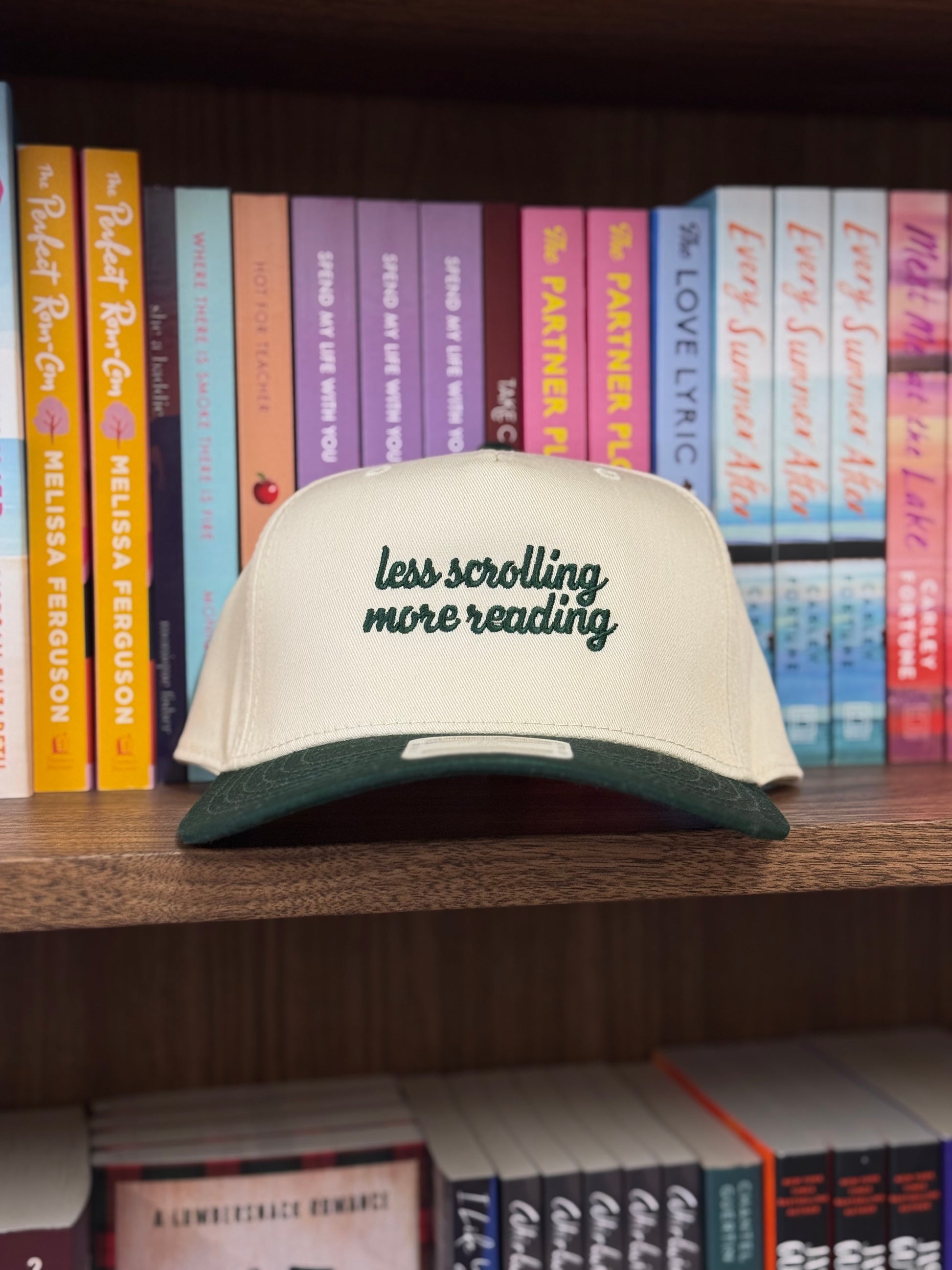 Featuring "less scrolling, more reading" embroidered on the front and "Heartbound Book Shop" stitched on the back, this cap is a cozy reminder to slow down and escape into a good story.